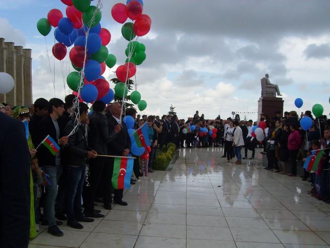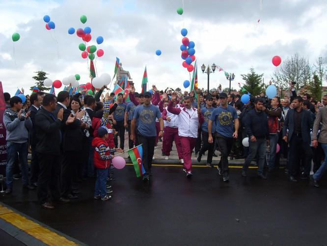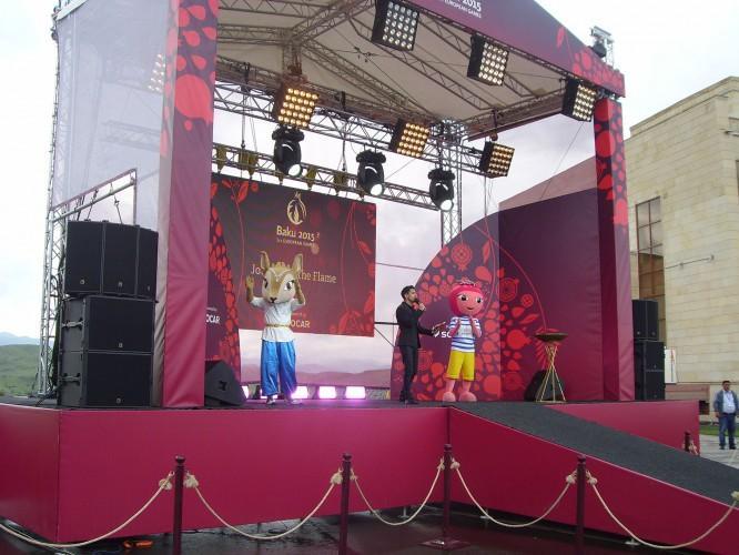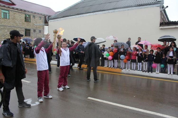 Şəhər 1 nömrəli orta məktəbin bədən tərbiyəsi müəllimi, idman ustalığına namizəd Vüqar İbrahimov səhnəyə qalxaraq məşəli alovlandırıb. Sonra məşəldən götürülmüş alovla yandırılan çıraq rayon sakinlərinə təqdim edilib. Bildirilib ki, bu çıraq ilk Avropa Oyunları başa çatana qədər Heydər Əliyev Mərkəzində yanacaq.