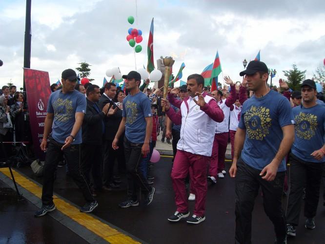 Avropa Oyunlarının rəmzi qapısında Göygöl rayon peşə məktəbinin bədən tərbiyəsi müəllimi Təhminə Əliyeva birinci Avropa Oyunlarının məşəlini qəbul edib. Sonra respublikamızı müxtəlif yarışlarda uğurla təmsil edən 10 idmançı məşəli Heydər Əliyev prospektindən keçməklə, Heydər Əliyev Mərkəzinin qarşısında qurulmuş səhnəyə gətirib. Buraya toplaşanlar Avropa Oyunlarının məşəl estafetini qəbul edən idmançıları alqışlarla qarşılayıblar.