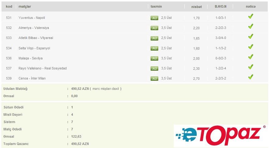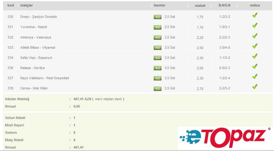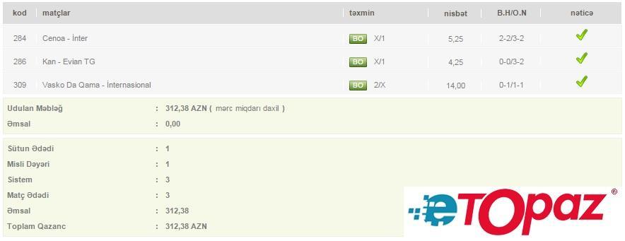 Azərbaycanda mərc oyunlarının yəganə qanuni elektron ünvanı - www.etopaz.az –da 24 may tarixdəki bəzi uduşlu kuponlar