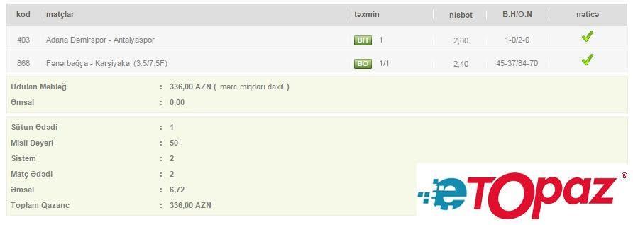 2 oyun üzrə 50 manatlıq kupon - udulan məbləğ 336 AZN