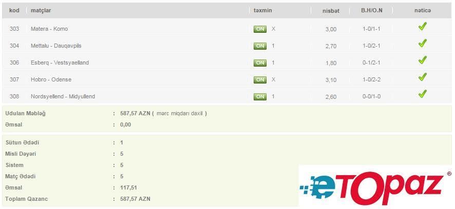 Azərbaycanda mərc oyunlarının yəganə qanuni elektron ünvanı - www.etopaz.az –da 1 iyun tarixdəki bəzi uduşlu kuponlar