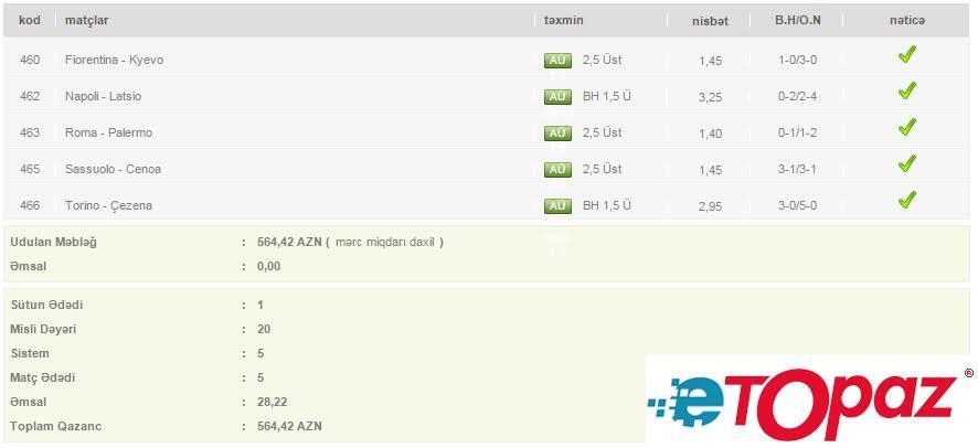 5 oyun üzrə 20 manatlıq kupon - udulan məbləğ 564 AZN