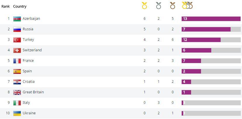 Azərbaycanın hesabında 6 qızıl, 2 gümüş və 5 bürünc medal var.