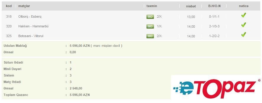 Azərbaycanda mərc oyunlarının yəganə qanuni elektron ünvanı - www.etopaz.az -da 20 iyul tarixdəki bəzi uduşlu kuponlar