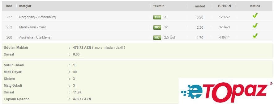 3 oyun üzrə 40 manatlıq kupon - udulan məbləğ 478 AZN