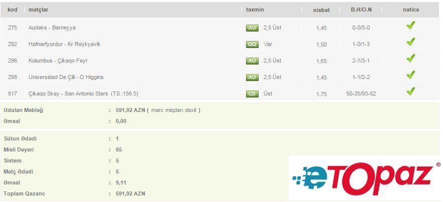 5 oyun üzrə 65 manatlıq kupon - udulan məbləğ 591 AZN