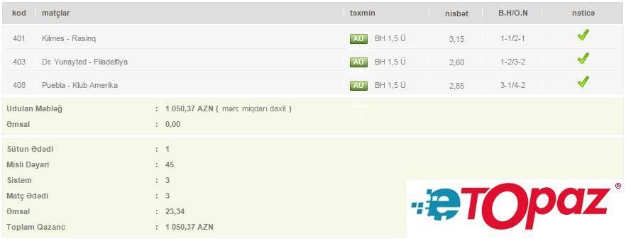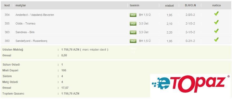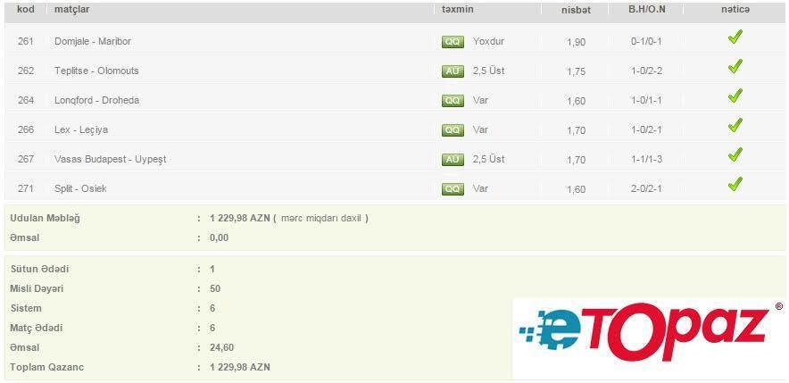 Azərbaycanda mərc oyunlarının yəganə qanuni elektron ünvanı - www.etopaz.az -da 26 iyul tarixdəki bəzi uduşlu kuponlar