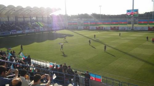 Qol.az-ın məlumatına görə, matçın 3-cü dəqiqəsində iki “Qarabağ” azarkeşi çiyinlərində Azərbaycan bayrağı ilə meydana daxil olaraq dövrə vurublar.