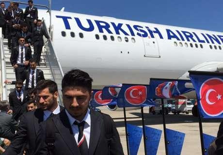 Fatih Terimin komandası türk bayraqları və çiçəklərlə qarşılanıb. Türkiyə yığması onlar üçün ayrılmış avtobusla qalacaqları otelə yola düşüb.