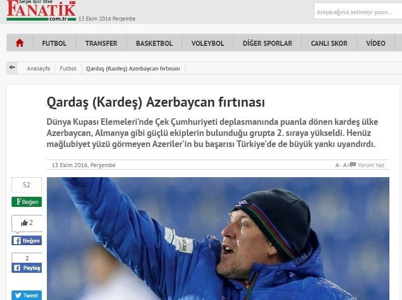 Türkiyənin "Fanatik" idman qəzeti DÇ-2018-in seçmə mərhələsində uğurlu çıxış edən millimiz haqda yazı dərc edib.